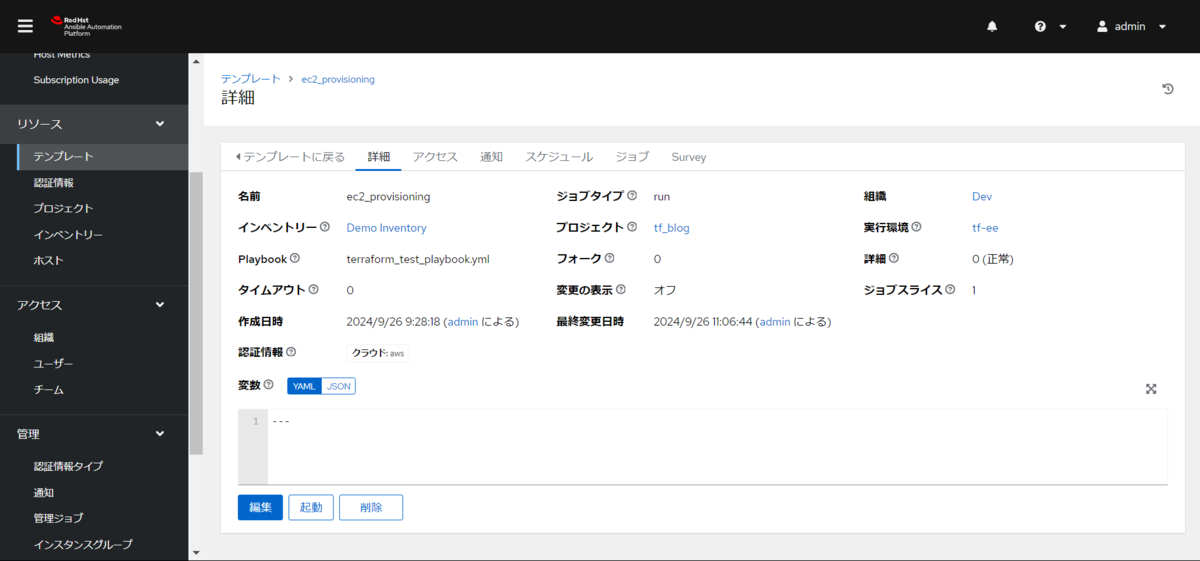 上記はAutomation Controllerに設定したAWS EC2インスタンスをプロビジョニングするジョブテンプレートの詳細画面です。 ジョブテンプレートには先ほど紹介したPlaybookを設定しています。