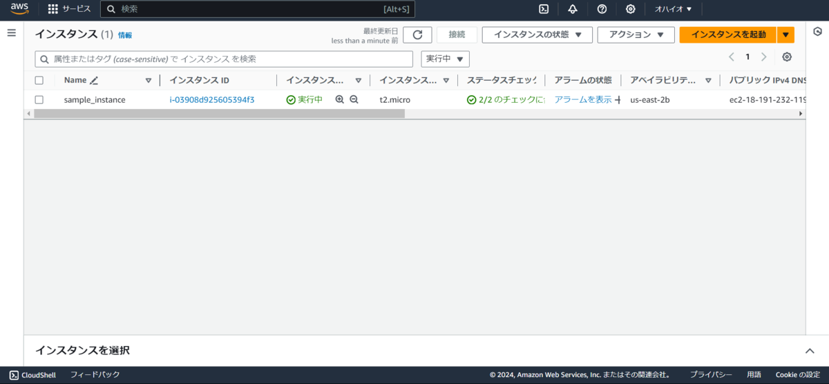 Automation Controllerのジョブによって「sample_instance」という名前のEC2インスタンスがオハイオリージョン(us-east-2)に作成されていることがわかります。